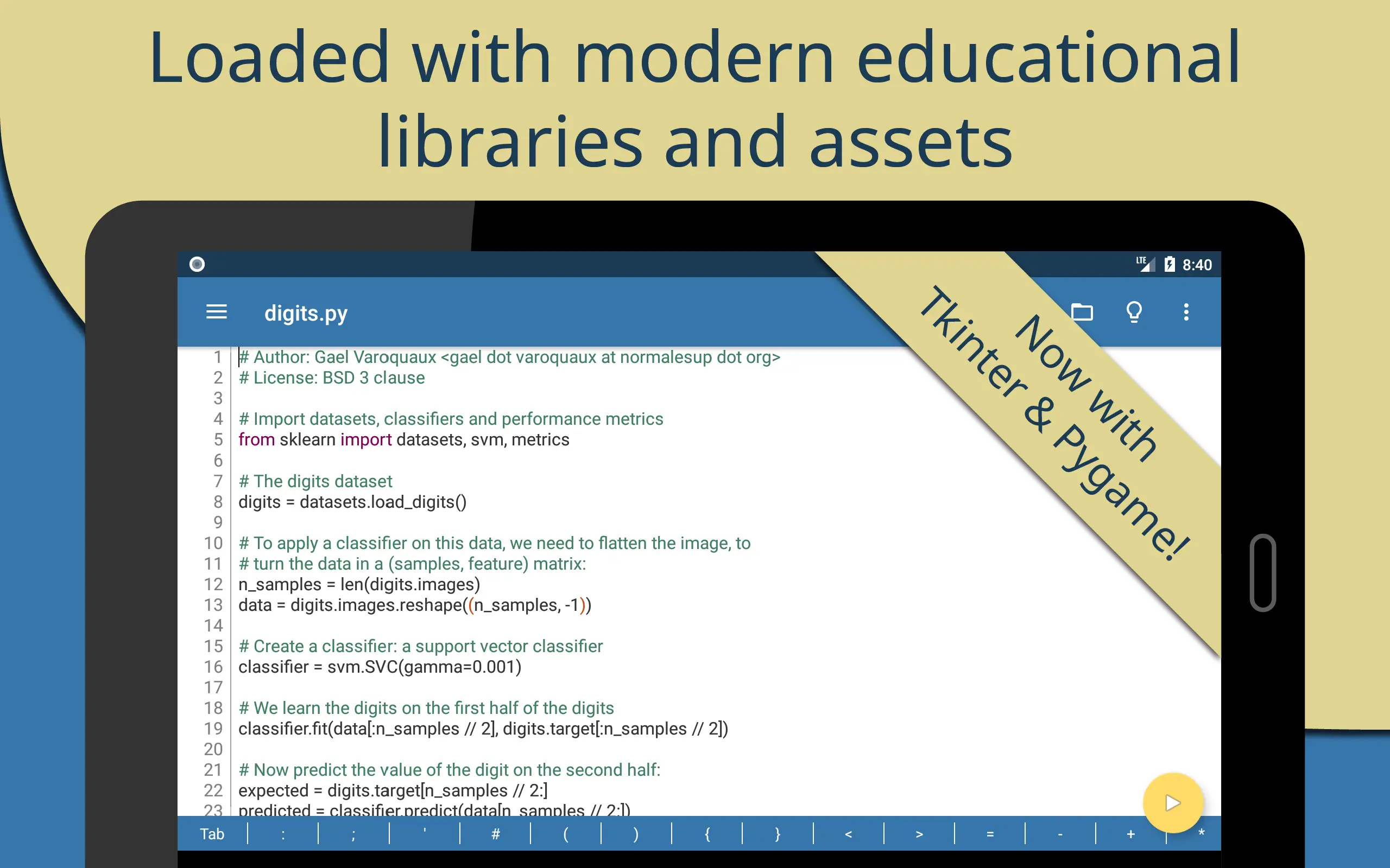 Pydroid 3 comes with a lot of built-in learning examples.