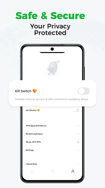 UFO VPN MOD APK contains a clean user interface with green and white colors mixed. After connecting the VPN, the cutest animation character appears with a smile. That looked like a monster, but it looked charming. Every beginner has more straightforward to use this application. Never need guidance for first-time use. The clean user interface will give a fantastic user experience. Simple to use any options from the application. Every connected connection status and connected time also appeared on the home section. Time-counting animations are amazing to view. Select the smart location option to choose the high coverage connection automatically.