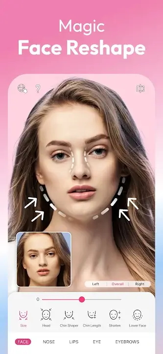 The magic retouch tool is an impressive functionality that the application values highly, as it enables users to alter their appearance in several innovative ways that they may not have previously contemplated. This includes many modifications, such as alterations to bone structure, changes in eye color, adjustments to nose height, variations in lip thickness, and numerous other features that individuals may like. The magic retouch method features numerous presets, each delivering substantial alterations that provide users considerable opportunities for personal transformation and fun.